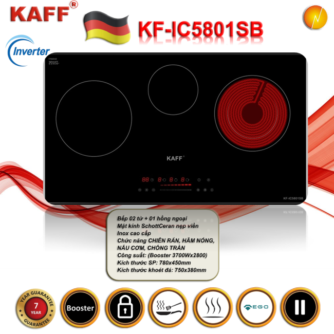 KF-IC5801SB – Xuất Xứ: Germany Đặc tính sản phẩm ▶️ Bếp 02 từ 01 điện ▶️ Mặt kính Shott Ceran Made in Germany siêu bền, chịu lực chịu sốc nhiệt ▶️ Đầu đốt EGO Made in Germany ▶️ Bo mạch IGBT SIMENS Made in Germany ▶️ Bàn phím điều khiển cảm ứng dạng trượt Slider, 9 dải công suất + BOOSTER ▶️ Tự động chia sẻ công suất (Power management) cho các vùng nấu khách nhau ▶️ Công nghệ biến tần INVERTER tiết kiệm 40% điện năng ▶️ Chức năng tự động tắt bếp khi để quên và khi không có nồi ▶️ Chức năng BOOSTER cực nhanh với bếp từ ▶️ Chức năng hẹn giờ, khóa trẻ em thông minh, tiện dụng ▶️ Chức năng tự nhận diện vùng nấu tiện dụng với các nồi lớn nhỏ ▶️ Chức năng 2 vòng nhiệt tiện dụng ▶️ Chức năng HÂM NÓNG ( Keep Warm) ▶️ Chức năng TẠM DỪNG (Pause) ▶️ Chức năng cảm ứng chống tràn ▶️ Chức năng cảm ứng quá nhiệt Thông tin kỷ thuật ▶️ Công suất bếp: 2200Wx1500Wx2200W ▶️ Kích thước mặt kính: 780x450mm ▶️ Kích thước khoét đá: 750x380mm |