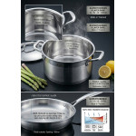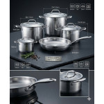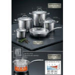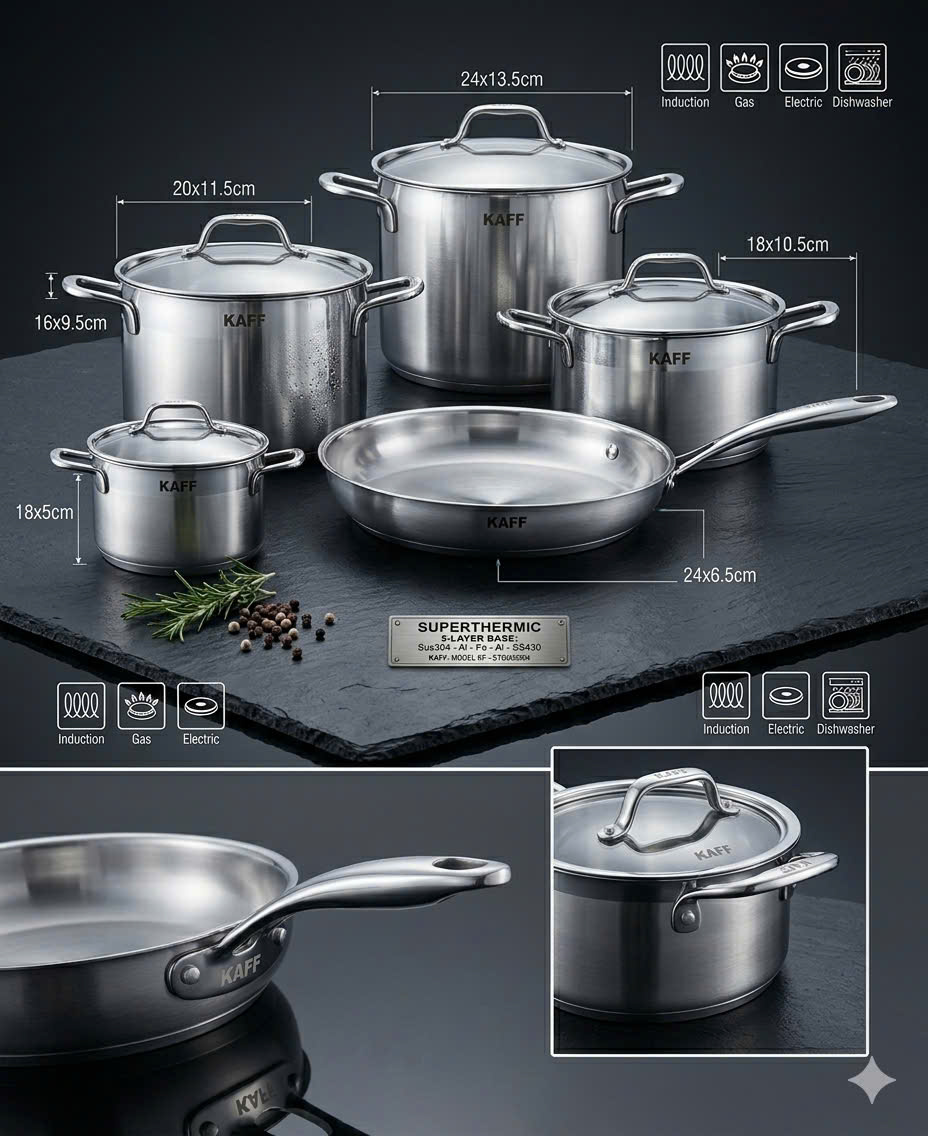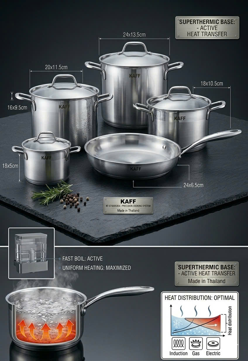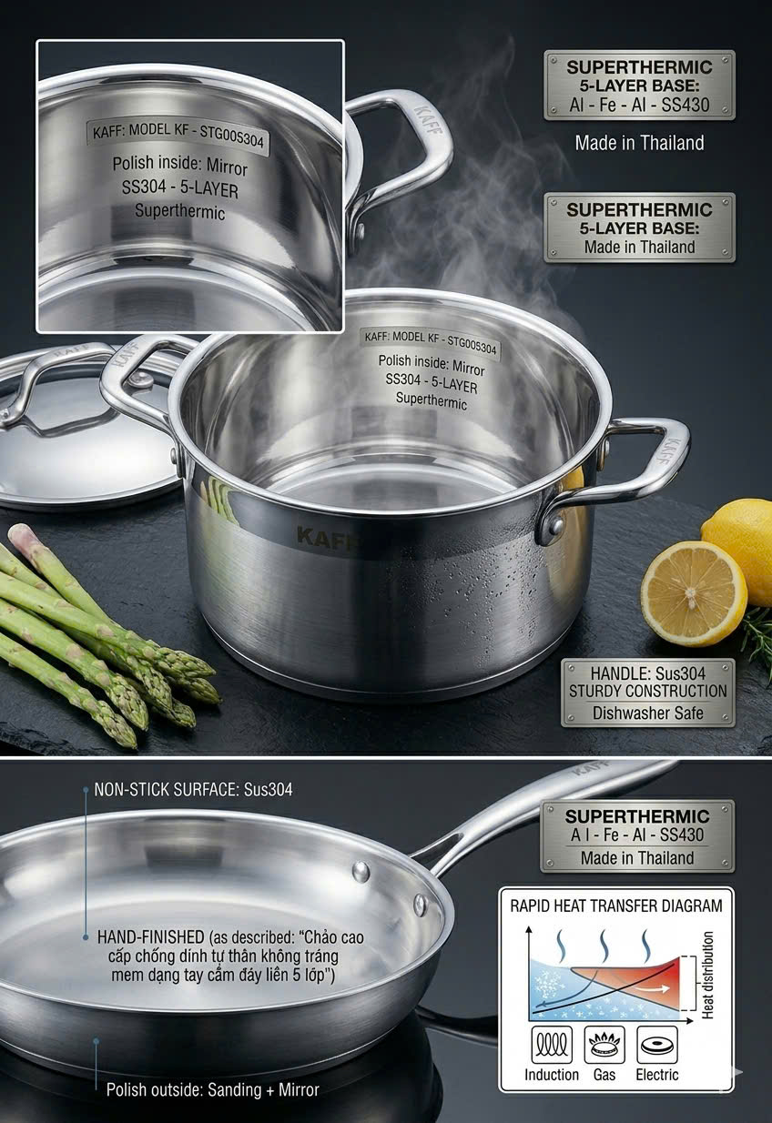 • Lớp ngoài cùng (SS430): Giúp bộ nồi tương thích hoàn hảo với mọi loại bếp, kể cả những dòng bếp từ kén nồi nhất.