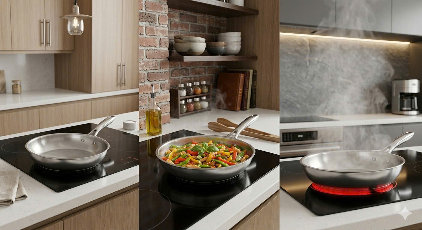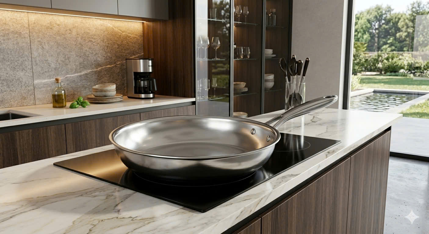 • Lớp ngoài cùng: Inox SS430 dày 0.6mm. Lớp này có từ tính mạnh, giúp chảo bắt từ siêu nhạy và phù hợp với mọi loại bếp (bếp từ, bếp điện, bếp gas, bếp hồng ngoại).