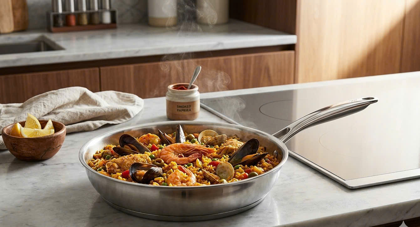 Sự kết hợp giữa SS304 + Sắt + Nhôm + SS430 giúp chảo có khả năng giữ nhiệt cực tốt và tỏa nhiệt đều khắp lòng chảo. Điều này giúp món áp chảo có lớp vỏ vàng giòn hoàn hảo mà bên trong vẫn giữ được độ mọng nước.
