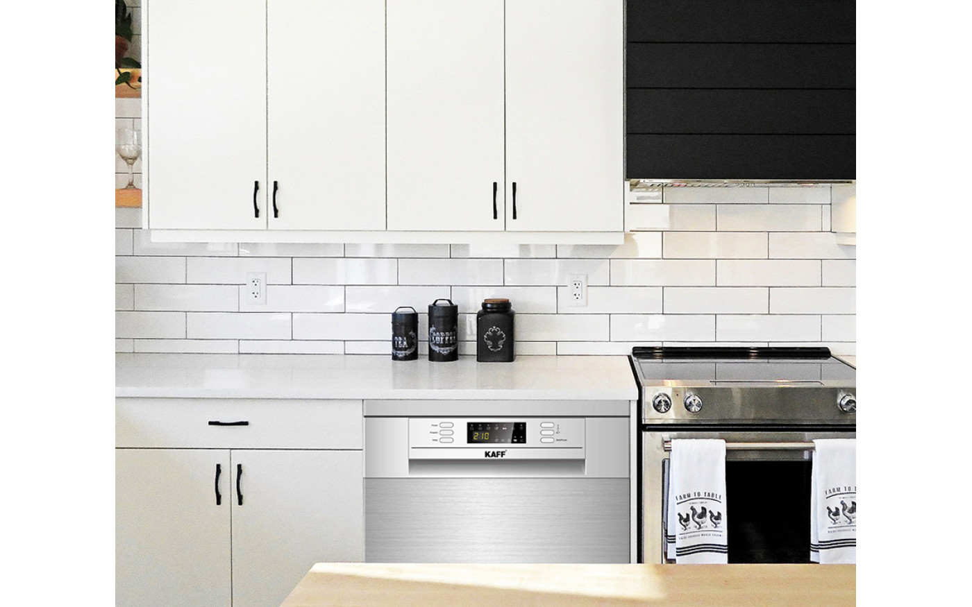 Máy rửa chén bát tự động mang thương hiệu Kaff có thiết kế đơn giản, nhưng tích hợp rất nhiều tính năng cao cấp như bảng điều khiển cảm ứng với màn hình Led, khung inox cứng cáp chống bám vân tay, dễ dàng vệ sinh. Thiết kế máy rửa bát Kaff có thể lắp độc lập hoặc âm tủ, rất phù hợp với không gian bếp của các gia đình.