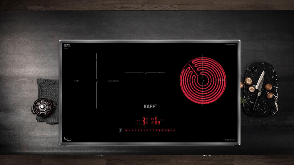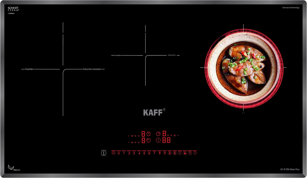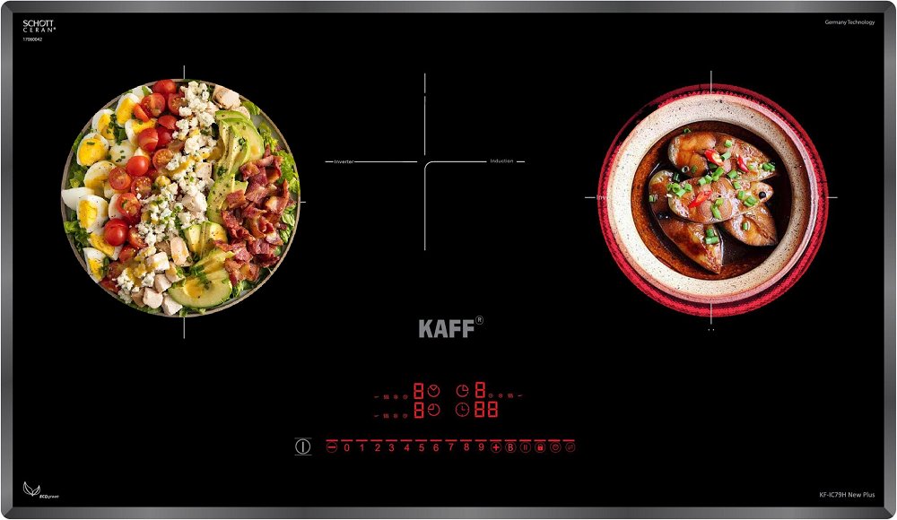 Bếp điện từ 3 vùng nấu: 2 từ kết hợp 1 hồng ngoại KAFF KF-IC79H New Plus, thuộc dòng bếp điện từ cao cấp của thương hiệu thiết bị nhà bếp nổi tiếng tại Đức KAFF, là sự kết hợp hoàn hảo giữa 2 bên bếp từ (sử dụng các bộ nồi chảo inox từ, tiết kiệm điện và đun nấu nhanh hơn) và 1 bên bếp điện hồng ngoại (không kén nồi và có thể nướng trực tiếp trên bề mặt bếp), 3 vùng nấu hỗn hợp (2 từ, 1 điện) phù hợp với gia đình đông thành viên và có không gian nhà bếp rộng. giúp cho cuộc sống của bạn thuận tiện hơn.